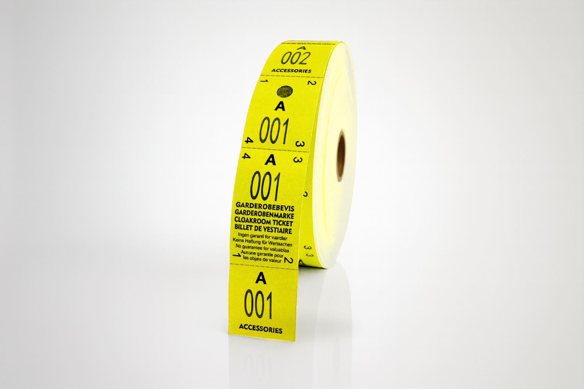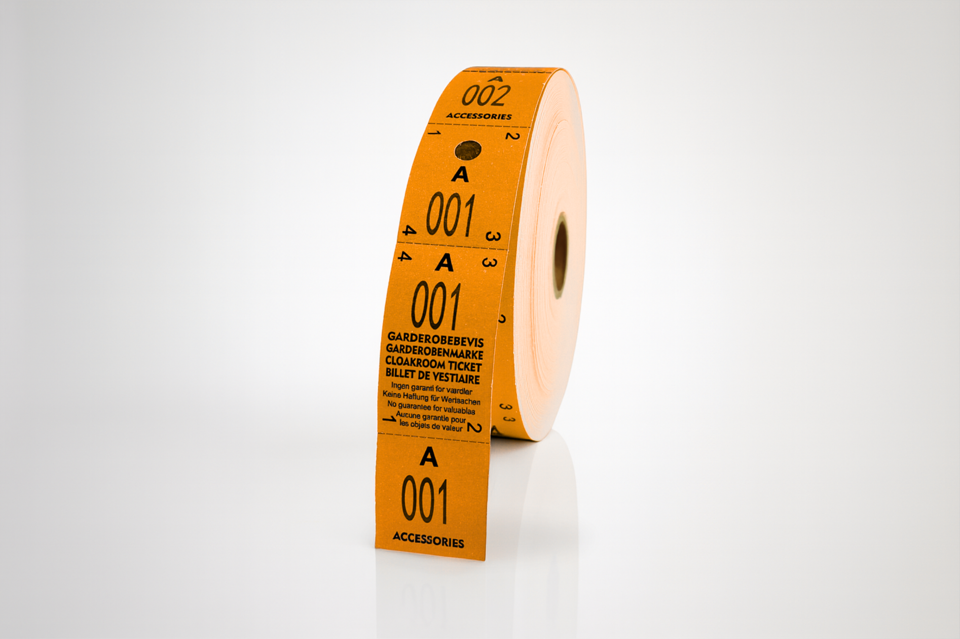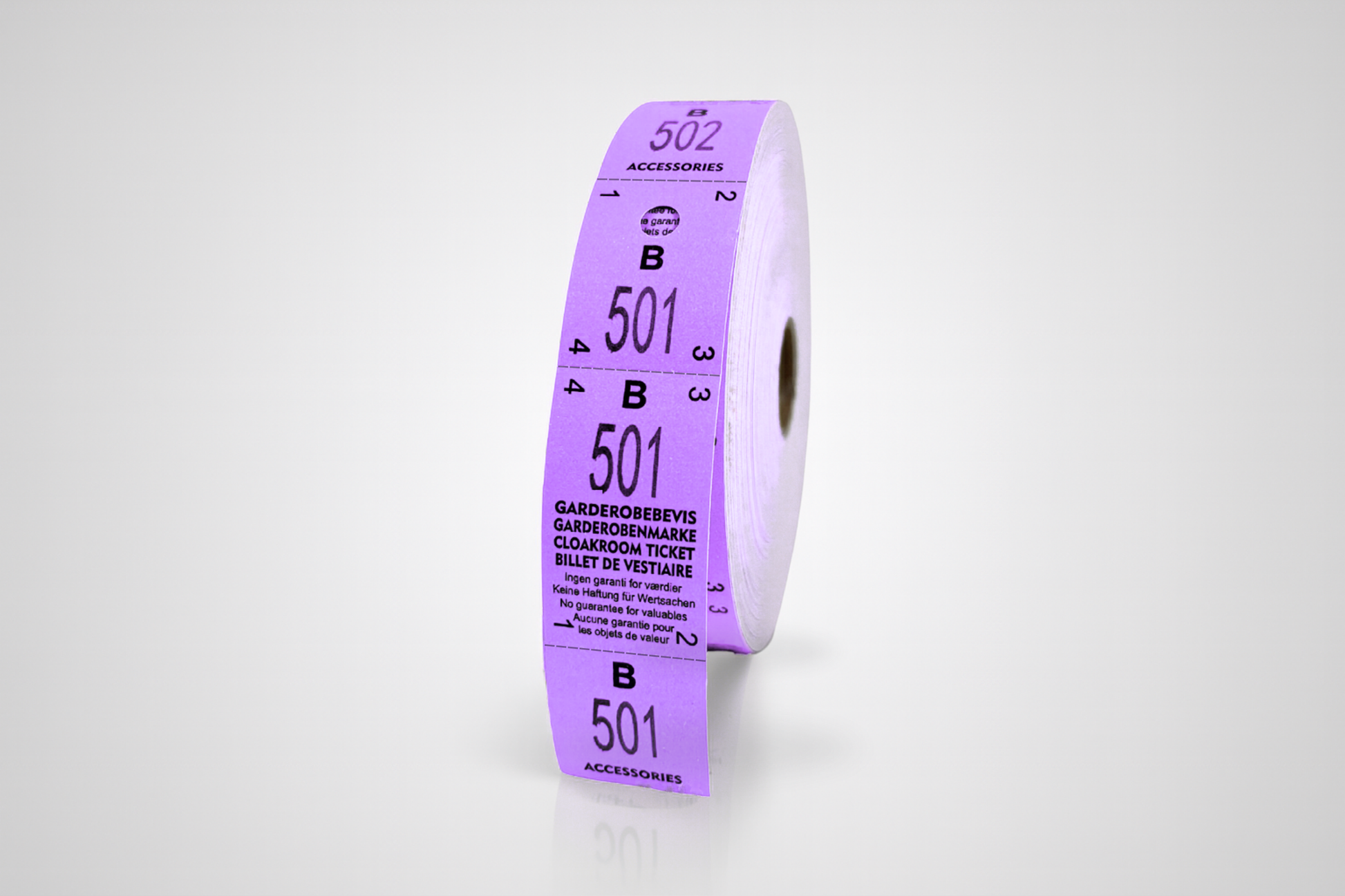 Specifikacije za garderobne kartice u tri dijela Role od 500 kartica svaka, 3 dijela. Numeriranje od 001–500 ili 501–1000. Prilikom narudžbe više od jedne role, role ćemo poslati u parovima numeriranim od 001 do 1000. Materijal: Debeli papir (120 g/m²) Veličina: Dio za kupce: 30 x 44,5 mm Dio za garderobu: 30 x 44,5 mm Dio za dodatke: 30 x 44,5 mm Promjer rupe: 8 mm Boje: Crvena, Žuta, Zelena, Plava, Ljubičasta, Bijela, Narančasta, Ružičasta. Tiskani tekst: "PROVJERA ZA GARDEROBU - Nema jamstva za dragocjenosti" Kartica za kupca s odgovarajućim listićem za pričvršćivanje na odjeću. Trodijelne garderobne oznake (500 komada) - za događaje s garderobom i pregledom Trodijelne garderobne oznake prikladne su za božićne zabave, klubove, restorane i sve vrste događaja s garderobom.
